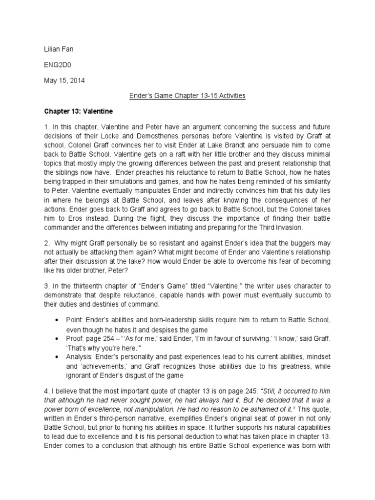Ender S Game Novel Study Questions Notre Dame Preparatory