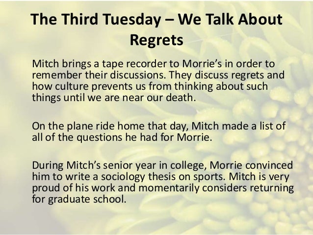 Learn exactly what happened in this chapter scene or section of tuesdays with morrie and what it means.